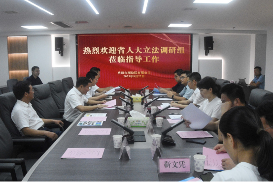 2023年8月22日下午,省人大常委会法工委副主席胡雪清带队赴我司开展测绘地理信息工作考察调研,市人大常委会法工委副主任周娜、市自然资源和规划局党组书记、局长许淞等参加。